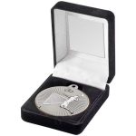 BLACK VELVET BOX AND 50mm BADMINTON MEDAL TROPHY MATT SILVER/SILVER – 3.5in