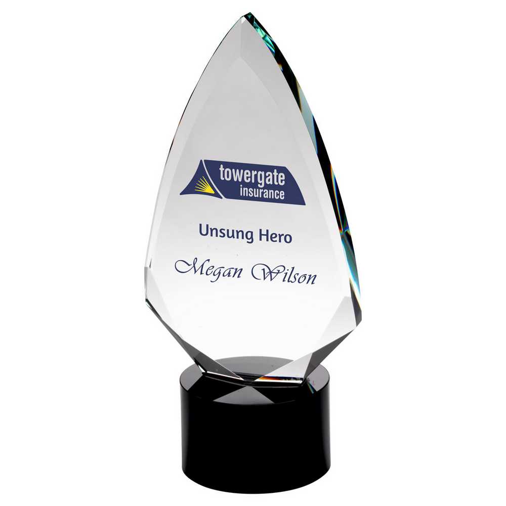CLEAR GLASS ARROWHEAD (20mm THICK) ON ROUND BLACK BASE – 9.75in