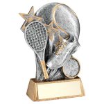 PEW/GOLD TENNIS BALL WITH RACKET ON BRZ BASE WITH PLATE (1in CEN) – 7.25in